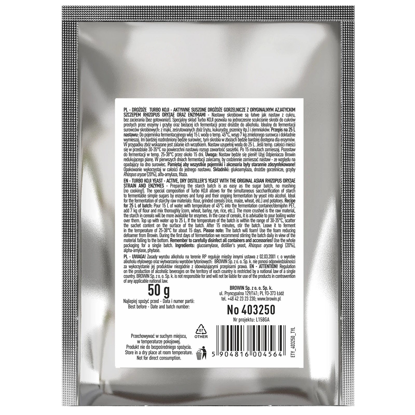 Drojdia Turbo Koji - drojdie de distilare activa, uscata, cu tulpina si enzime originale asiatice de Rhizopus oryzae - permite fermentarea loturilor de amidon din faina, boabe fragmentate (orez, porumb, grau etc.) si din cartof fara plamadire la cald.